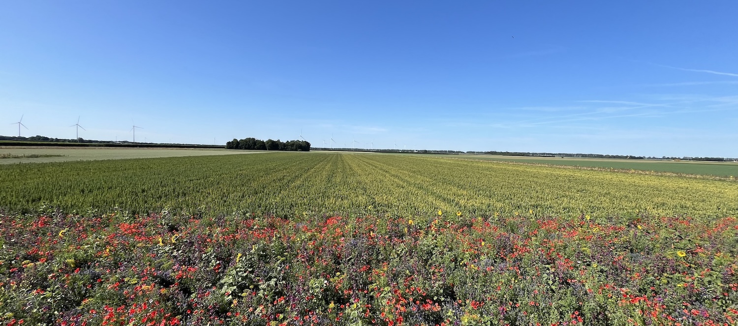 Quinoa Holland vindt het belangrijk om de biodiversiteit te bevorderen. Dit doen wij door een brede rand met bloemen en planten in te zaaien om de quinoa velden heen.